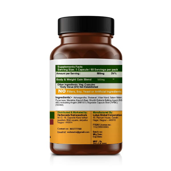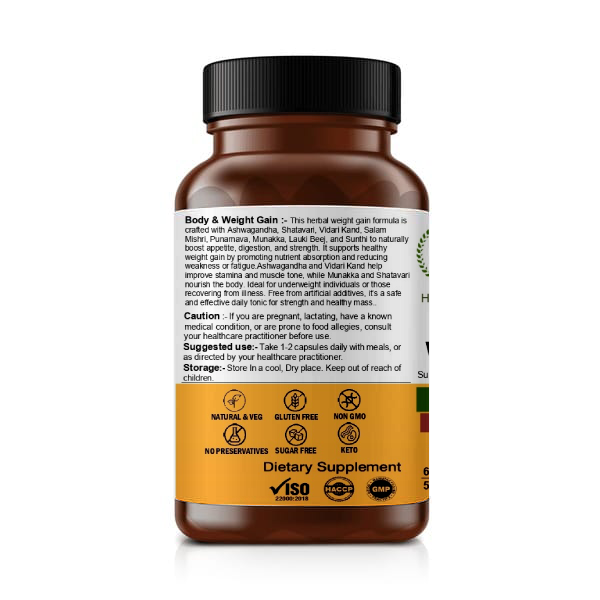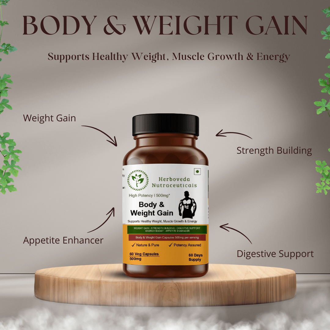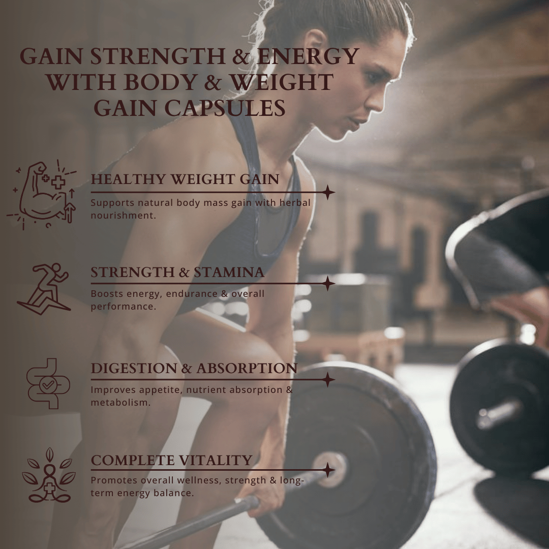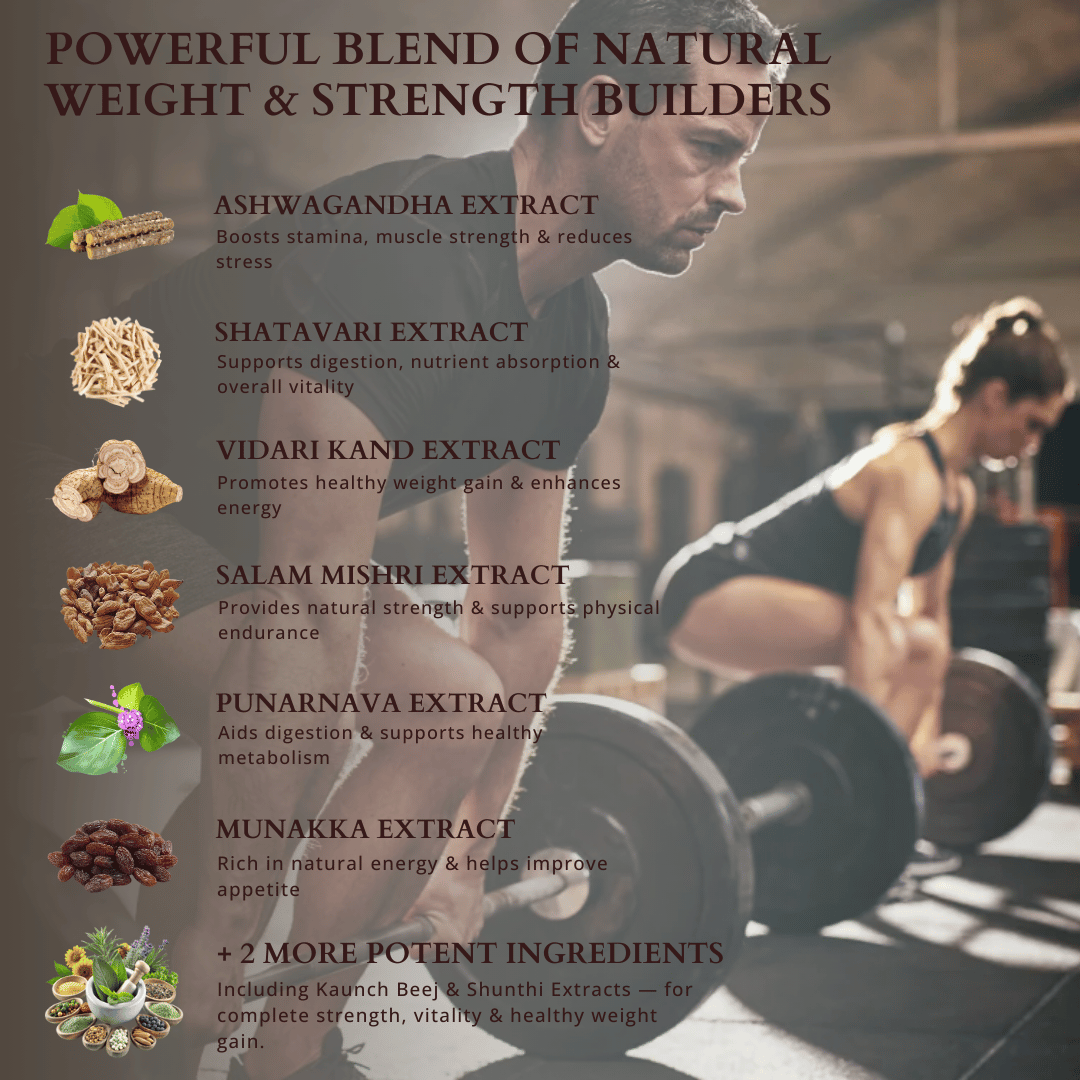 This formulation combines traditional Ayurvedic herbs known to support appetite, nutrient absorption, muscle development, and sustained energy. It helps promote balanced weight gain by supporting digestion, metabolism, and muscle nourishment rather than unhealthy fat accumulation.