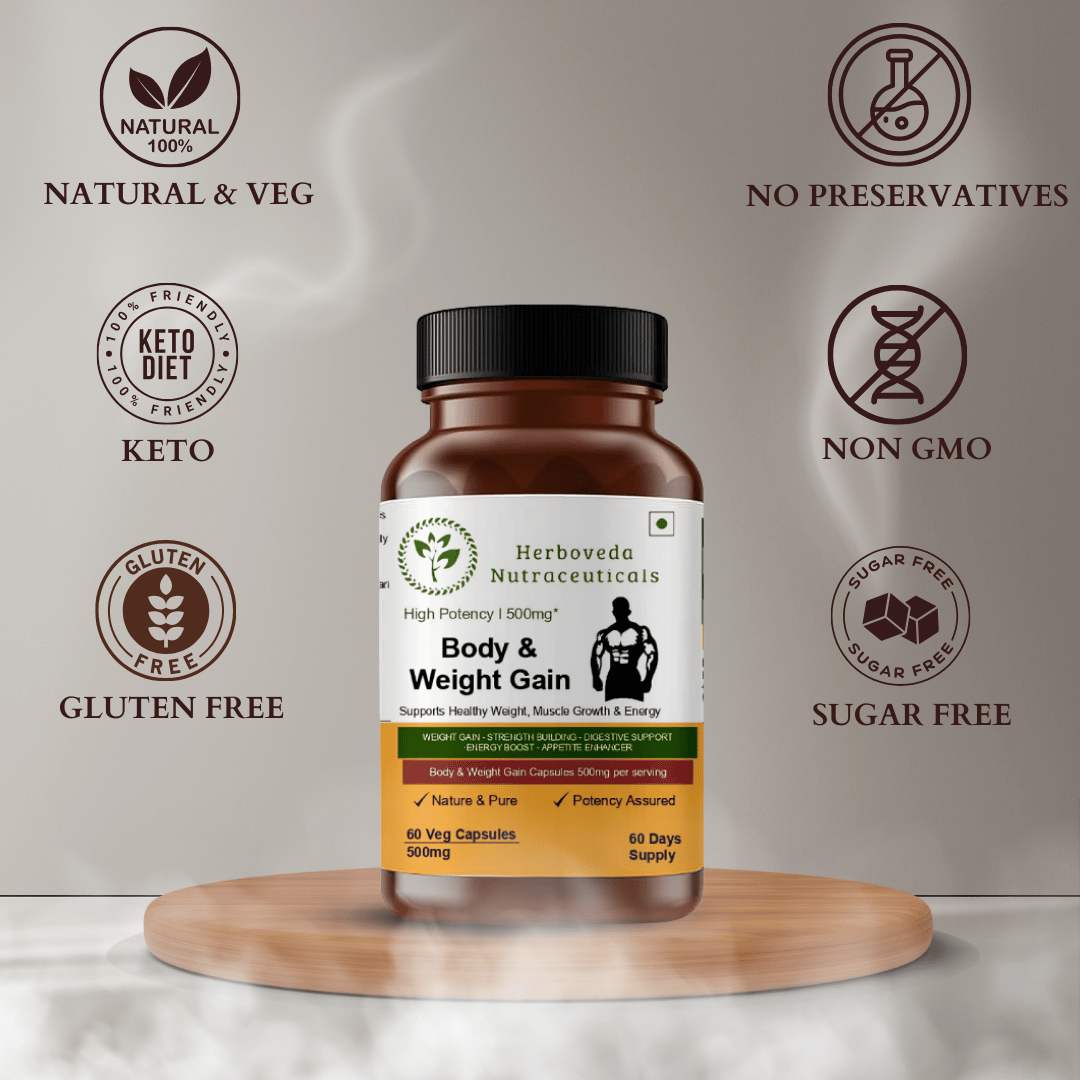 This formulation combines traditional Ayurvedic herbs known to support appetite, nutrient absorption, muscle development, and sustained energy. It helps promote balanced weight gain by supporting digestion, metabolism, and muscle nourishment rather than unhealthy fat accumulation.